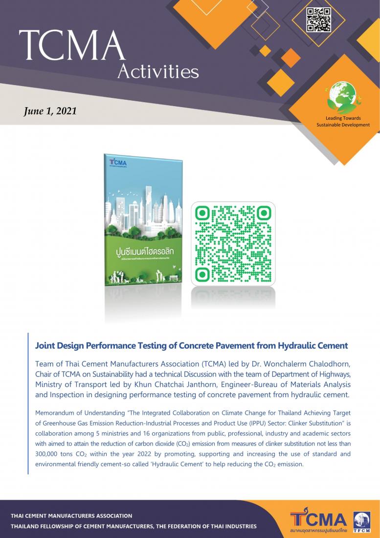 June 6, 2021: Team of Thai Cement Manufacturers Association (TCMA) led by Dr. Wonchalerm Chalodhorn, Chair of TCMA on Sustainability had a technical Discussion with the team of Department of Highways, Ministry of Transport led by Khun Chatchai Janthorn, Engineer-Bureau of Materials Analysis and Inspection in designing performance testing of concrete pavement from hydraulic cement. Memorandum of Understanding “The Integrated Collaboration on Climate Change for Thailand Achieving Target of Greenhouse Gas Emission Reduction-Industrial Processes and Product Use (IPPU) Sector: Clinker Substitution” is collaboration among 5 ministries and 16 organizations from public, professional, industry and academic sectors with aimed to attain the reduction of carbon dioxide (CO2) emission from measures of clinker substitution not less than 300,000 tons CO2 within the year 2022 by promoting, supporting and increasing the use of standard and environmental friendly cement-so called ‘Hydraulic Cement’ to help reducing the CO2 emission. |
