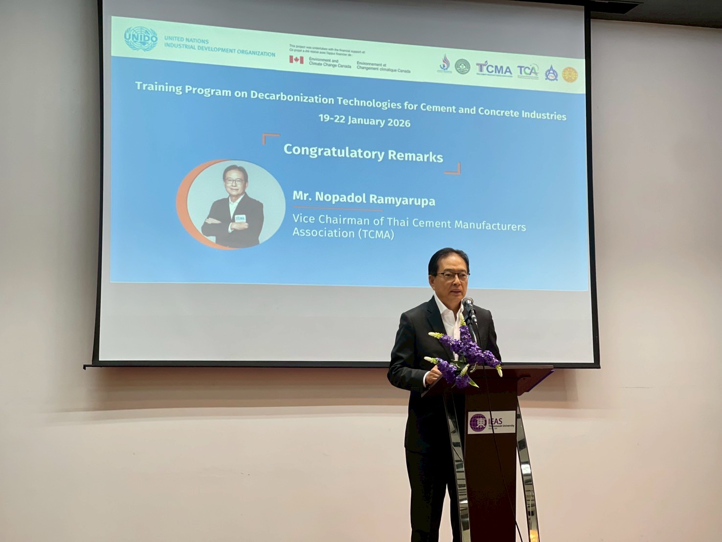 Khun Nopadol Ramyarupa, Vice Chairman of Thai Cement Manufacturers Association (TCMA), delivered congratulatory remarks at the opening of the training program “Decarbonization Technology for Cement and Concrete Industries”, with Khun Rapee Sukhyanga, Vice Chairman and Secretary General, and TCMA executives in attendance, organized by the Thai-Nichi Institute of Technology (TNI) and Thammasat University (TU) with support from UNIDO and funding from Environment and Climate Change Canada (ECCC). It underscored the importance of developing human capital alongside technological innovation and supportive policy frameworks as key drivers of a sustainable transition toward Net Zero.