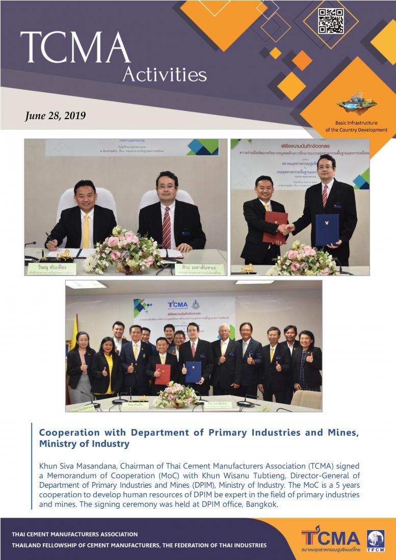 June 28, 2019: Khun Siva Masandana, Chairman of Thai Cement Manufacturers Association (TCMA) signed a Memorandum of Cooperation (MoC) with Khun Wisanu Tubtieng, Director-General of Department of Primary Industries and Mines (DPIM), Ministry of Industry. The MoC is a 5 years cooperation to develop human resources of DPIM be expert in the field of primary industries and mines. The signing ceremony was held at DPIM office, Bangkok. |
